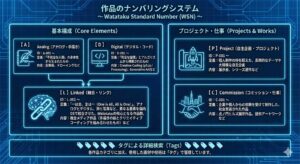 上達の研究家として、僕は生まれた作品を単なる「絵」ではなく、思考の結晶(Log)として扱います。 膨大な実験記録を管理し、後世に残すために、独自の分類システム「Watataku Standard Number (WSN)」を構築しました。