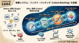 ▼ 執筆が「辛い」と感じる方へ この「言語化」の工程で脳が疲れてしまうなら、僕が開発した「リンクド・バッチング」というシステムを使ってみてください。単発で書くのではなく、4つの記事を一筆書きで設計することで、驚くほどスムーズに書けるようになります。