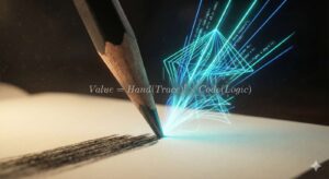 木製の机の上に置かれた開いた本から、光り輝く螺旋状のデータストリームが未来的なサイバースペースへと飛び出していくファンタジーコンセプトアート。ストリームの中にはブログ記事、コード、グラフ、建築図面が浮かび、中心には数式「Value = (Source - Hand)^t \times Code(Logic)」が刻まれている。背景には無限に広がるデジタルグリッドと、「A-001」から「A-150000」へと続く膨大なインデックス登録の跡が星のように輝いている。LSPプロトコルに基づく創造性の蓄積と爆発を表現。